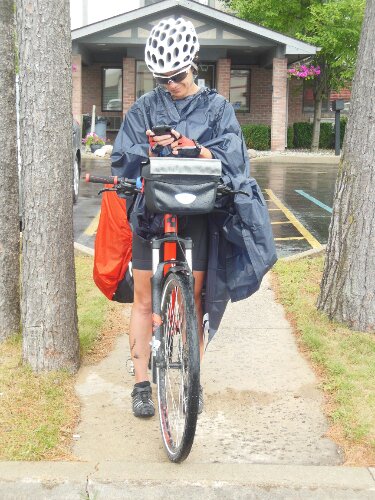 En un momento de tregua de lluvia ponemos la tienda… y nos volvemos a poner las capas de lluvia para ir hasta Mc Donalds en bicicleta. Aun llueve más que antes, pero no tenemos otra opción, en el camping no podemos preparar nada… ;(